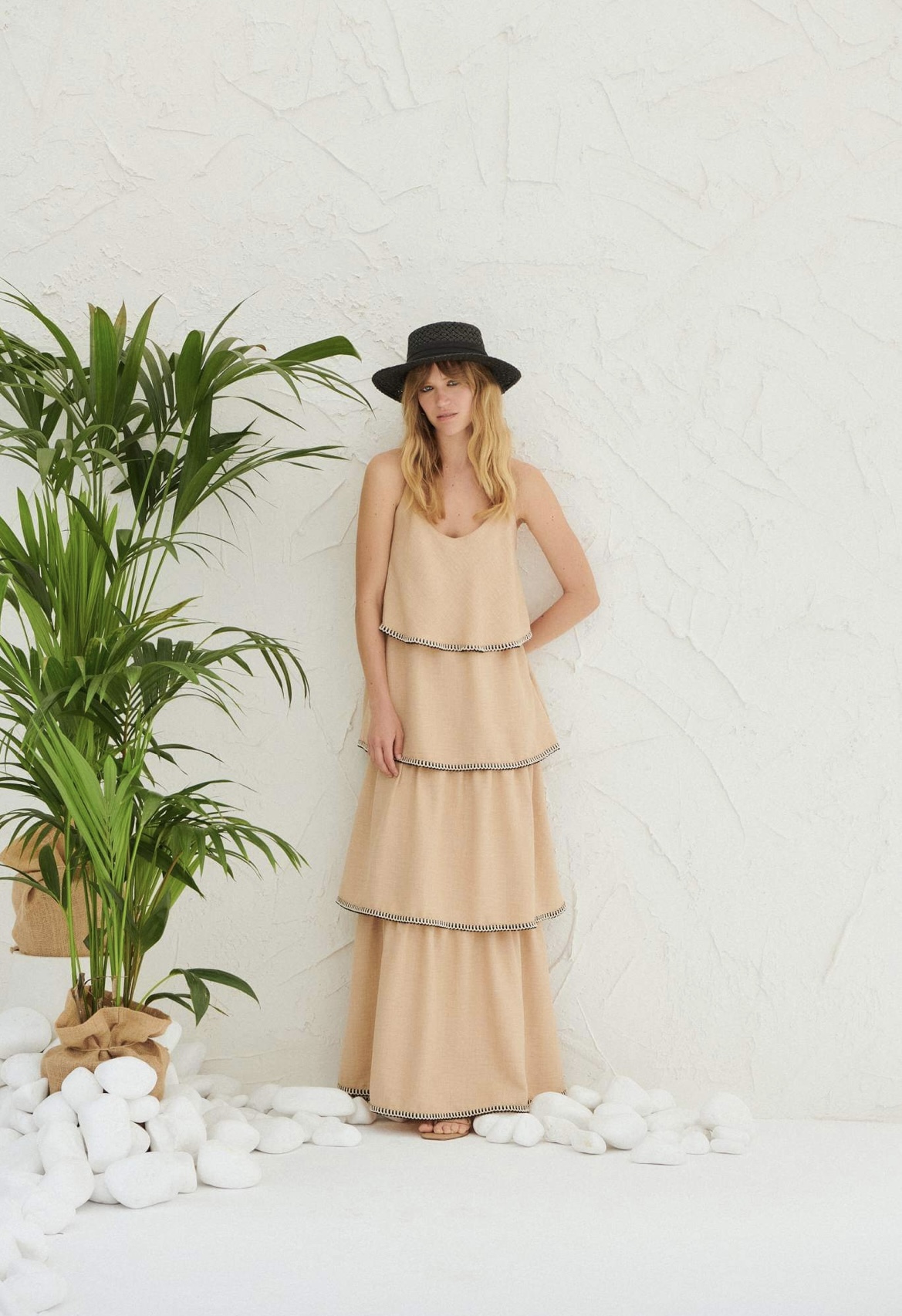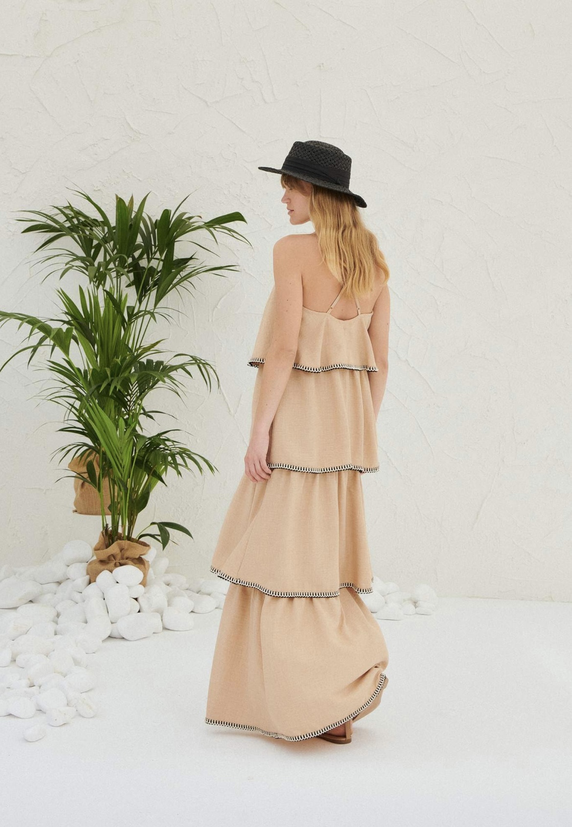 Φόρεμα μακρύ απο λίνο με λεπτές τιράντες και βολάν σε όλο το μήκος του φορέματος έχει στρογγυλή λαιμόκοψη και στο τελείωμα των βολάν έχει μαύρες ραφές ως λεπτομέρειες,το πίσω μέρος οι τιράντες κάνουν χιαστί και υπάρχουν μεγέθη