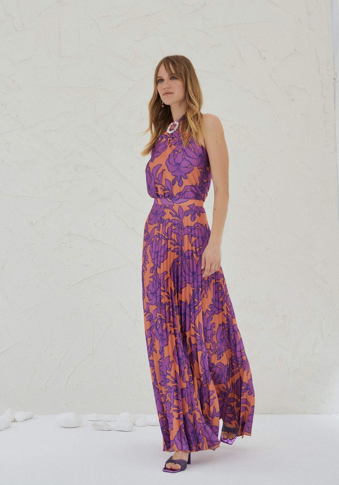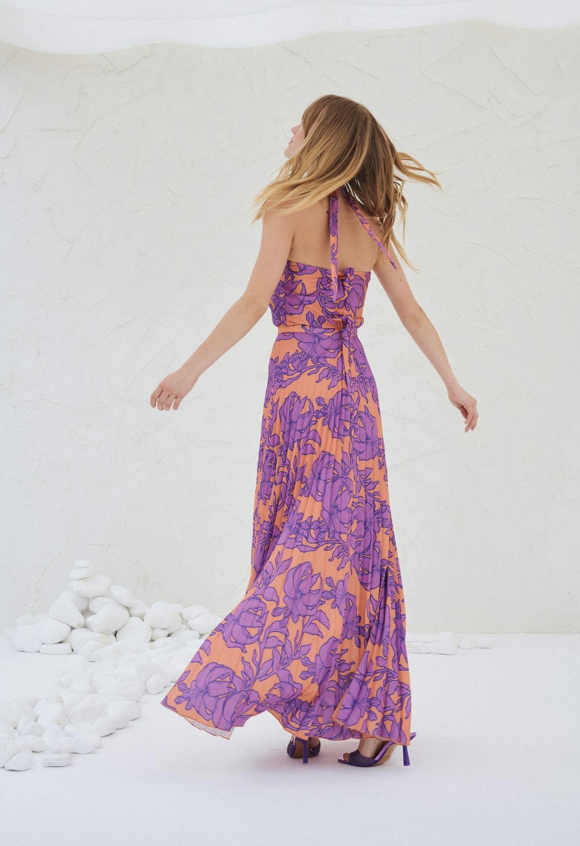 Φόρεμα μακρύ εμπριμέ απο πλισέ ύφασμα που δένει στο πίσω στο λαιμό,έχει αγκράφα μπροστά στο λαιμό,ανάλαφρο στύλ,υπάρχουν μεγέθη