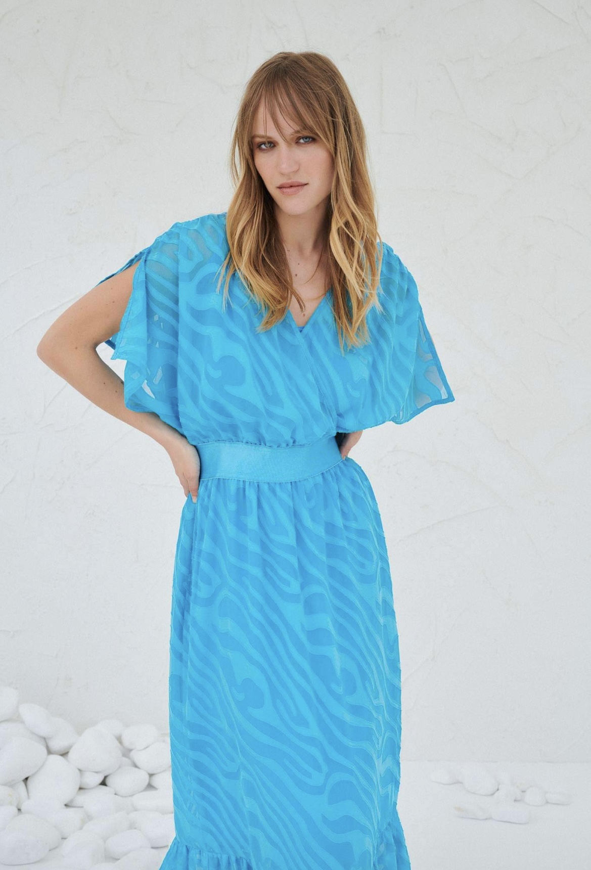 Φόρεμα μακρύ απο μουσελίνα που έχει σχέδια εσωτερικά με μανίκια ανάλαφρο στύλ με ζώνη στη μέση και βολάν στο τελείωμα,βε στο ντεκολτέ,υπάρχουν μεγέθη