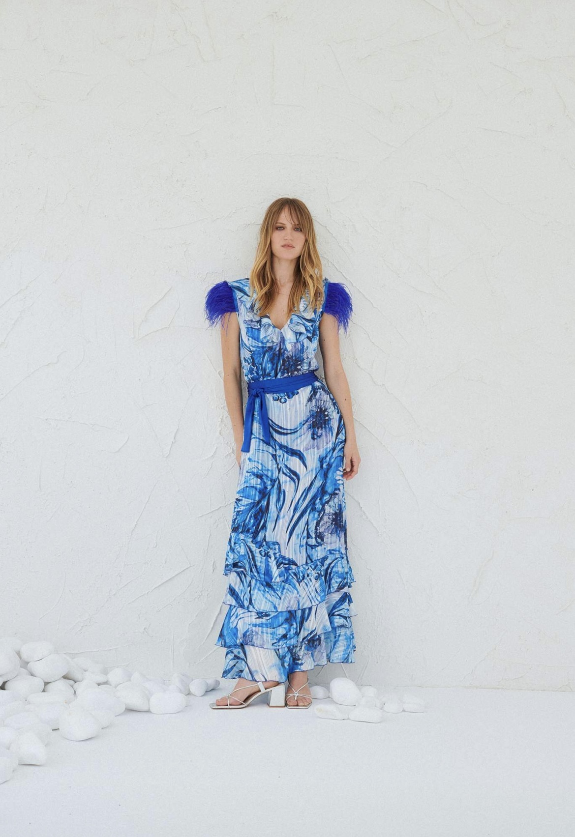 Φόρεμα μακρύ εμπριμέ απο λουρεξ μουσελίνα με πουπουλα στα μανίκια,ζώνη στη μέση σατέν και βολάν στο τελείωμα,ανάλαφρου στύλ,υπάρχουν μεγέθη